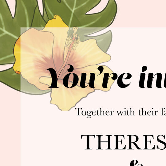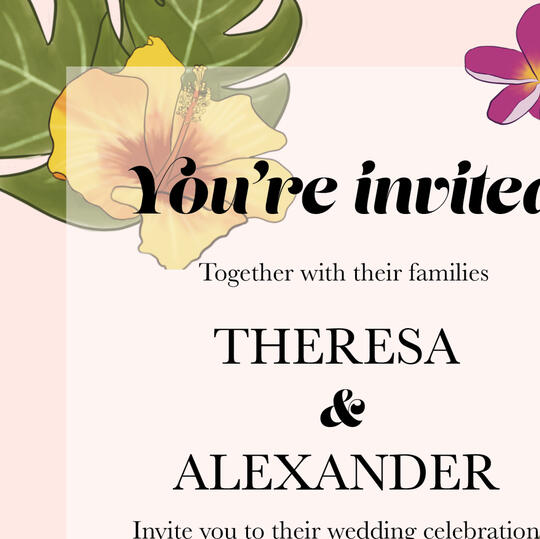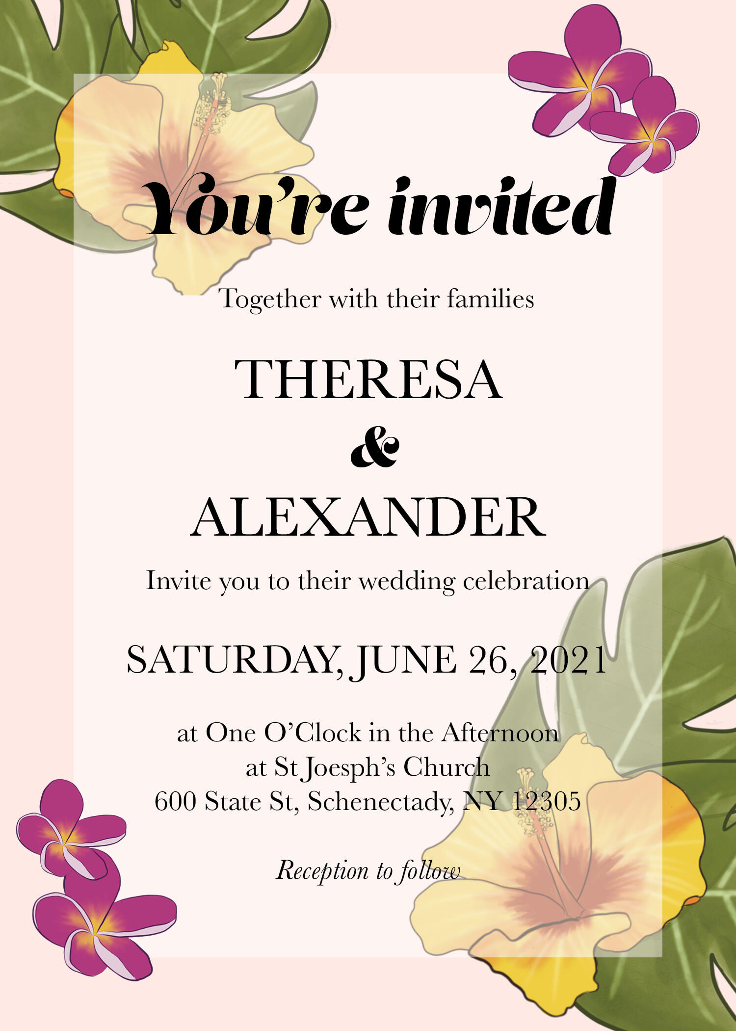 A wedding package that includes an invitation design, RSVP/Reception card and table cards.